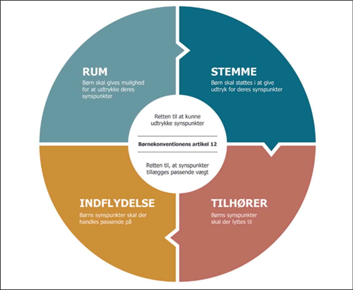 - Modellens elementer Rum og Stemme handler om børn og unges ret til at udtrykke synspunkter.